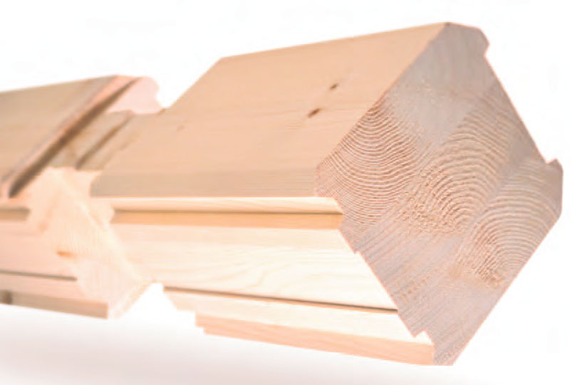 Клееный брус собирают из длинных досок — ламелей. В сечении он состоит из нескольких накрепко склеенных между собой частей (от 2 до 8, чаще всего 3-5). Длина такого составного изделия может достигать 12 м и более, толщина определяется требованиями теплозащиты стены и прочности конструкции, обычно 75-300 мм. Профилирование способствует жесткому сцеплению элементов в стене.