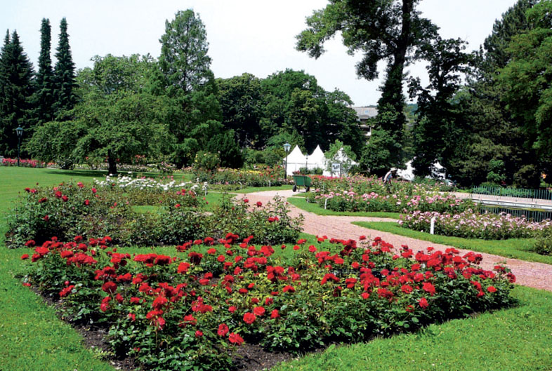 Розарий в Бадене (Фото: Юта Арбатская)«Баден — небольшой курортный городок на востоке Австрии, известный своими многочисленными термальными источниками. Он находится примерно в часе езды от Вены и славен богатой историей. Первые письменные упоминания о строениях в этой местности относятся к 1233 г., но лишь с 1450 г. здесь образовалась небольшая деревня Вайкерсдорф. В середине XVIII века потомками княжеского рода Доблхоф на территории деревни возводится замок Вайльбург, ставший впоследствии фамильным имением семейства Доблхоф вплоть до второй мировой войны. Вокруг замка был разбит чудесный парк в стиле барокко, с ручьями, мельницей и озером. В 1830 году он представлял собой романтический парк в английском пейзажном стиле с отдельными элементами регулярной планировки. На озере (существующем и сегодня) находилась лодочная станция, вокруг замка ежегодно высаживалось множество цветов. В летнее время по всему парку расставлялись экзотические растения в вазах и объемных кадках, а на зиму их заносили в оранжерею. Центральными осями в парке служили каштановые аллеи, часть которых сохранилась. Наибольшего расцвета имение и принадлежавший ему парк получили во времена Антона фон Доблхоф-Дайера (1800–1872 гг).